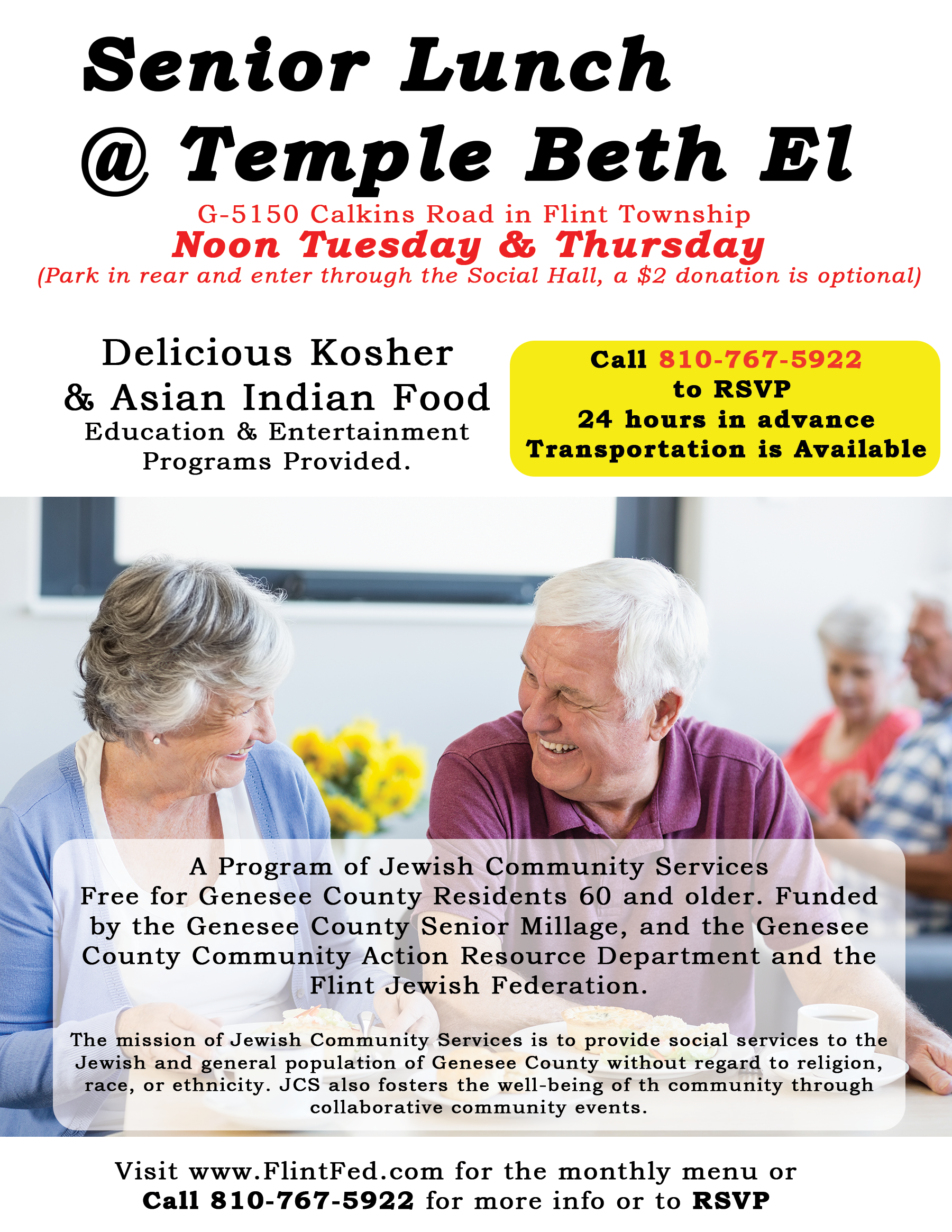 Through a partnership with the “Grill of India” restaurant, JCS provides congregate vegetarian meals twice a week at Temple Beth El. Indian vegetarian mobile meals are also available for homebound Genesee County seniors.